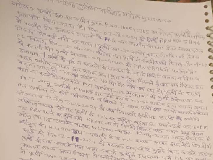 सिपाही ने एसएसपी को संबोधित करते हुए सुसाइड नोट लिखा। कहा- मैं कॉन्स्टेबल अमित कुमार आत्महत्या करने जा रहा हूं। महोदय प्रार्थी को मानसिक प्रताड़ित किया जा रहा है। 3 अगस्त 2024 को पीआरवी संख्या 5896 में 40 लीटर डीजल डलवाया गया, जोकि हेड कॉन्स्टेबल शमीम अहमद ने डलवाया। जिसका डी कार्ड नहीं करवाया गया।