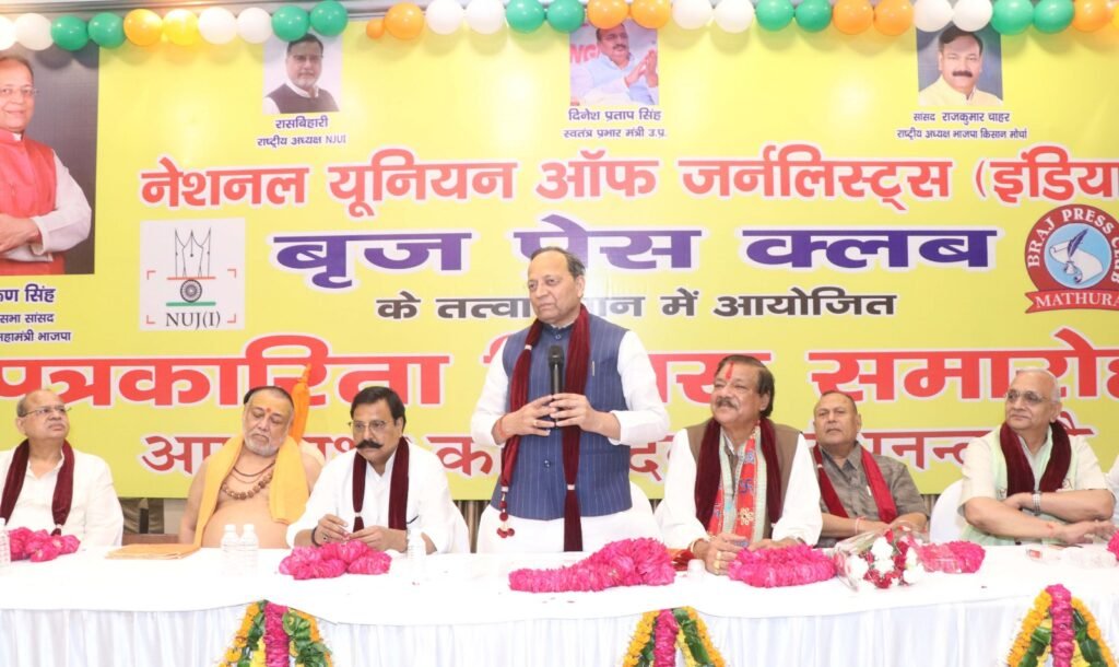 फोटो-ब्रज प्रेस क्लब एवं एनयूजेआई द्वारा आयोजित पत्रकार दिवस समारोह को संबोधित करते भाजपा के राष्ट्रीय महासचिव व राज्यसभा सांसद अरूण सिंह